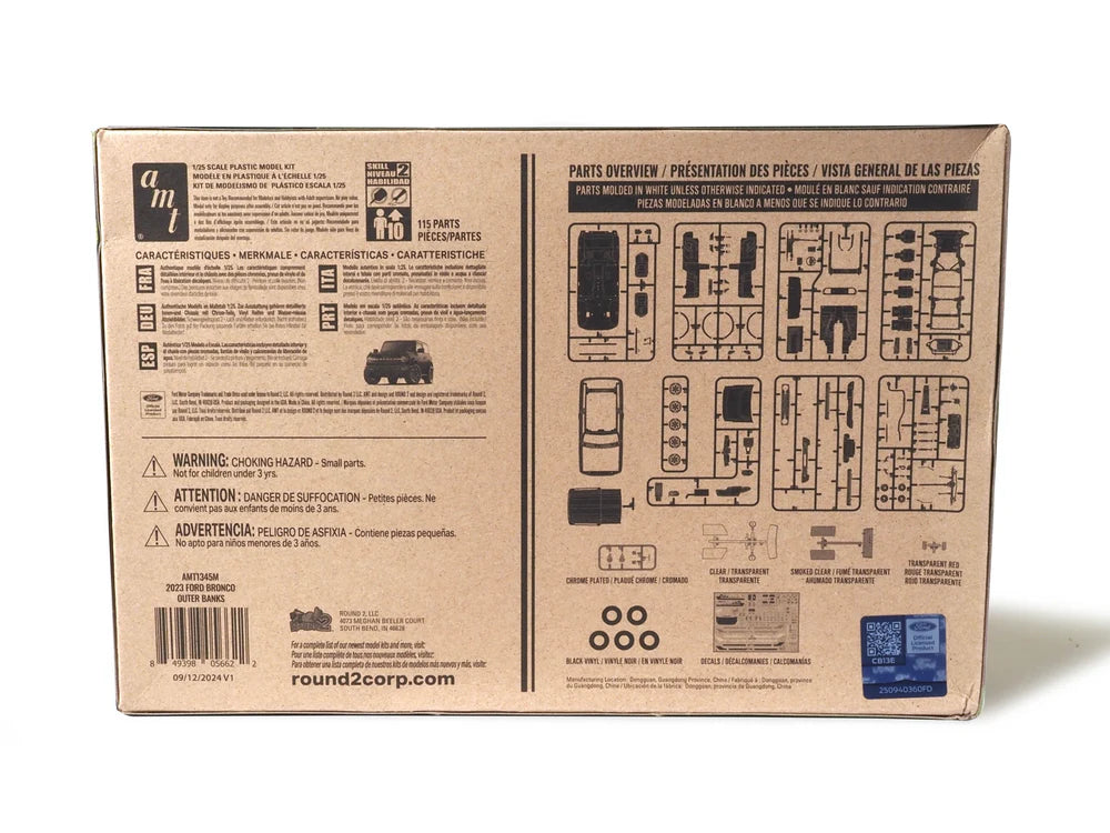 The 2023 Ford Bronco Outer Banks curbside kit features authentic details from bumper to bumper. The kit includes authentic Bronco grille and bumper details, a detailed chassis, 18-inch OEM wheels, a detailed interior, a spare tire, and a removable hardtop with smoked clear windows. There is also an ALL NEW authentically accurate water-slide decal sheet with colorful options.